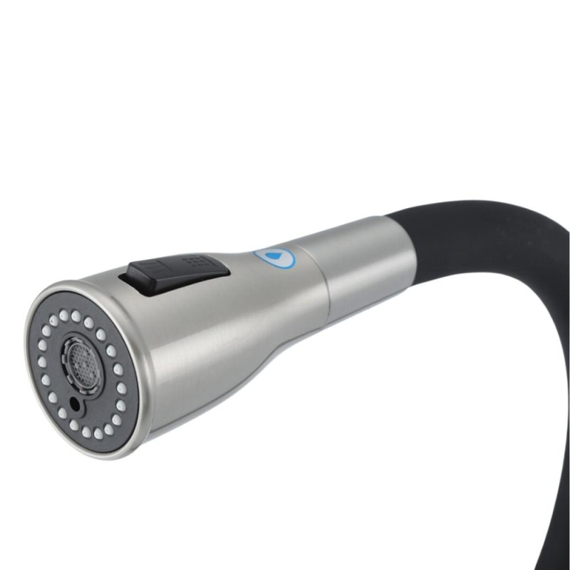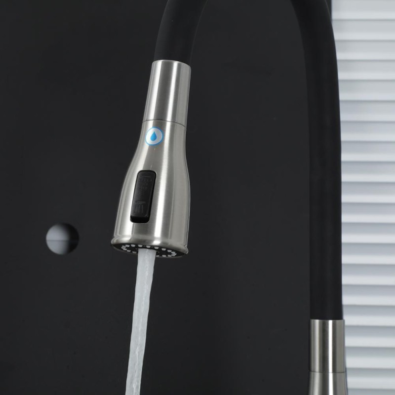 Стильний дизайн: Корпус змішувача виконаний у привабливому сатиновому відтінку, а силіконовий вилив чорного кольору, що додає елегантності вашій кухні.