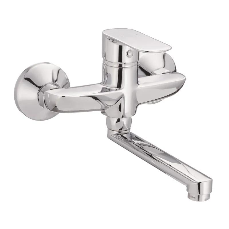 Змішувач для кухні Haiba ASIO 005 (HB0865) для настінного кріплення складається з латунного корпусу і поворотного виливу. Всі металеві поверхні змішувача покриті глянцевим хромом. Вилив обертається на 360 градусів, але в робочому стані кут обмежується самою стіною. Управління - одноручнковое. Запірний елемент - картридж 35 мм.