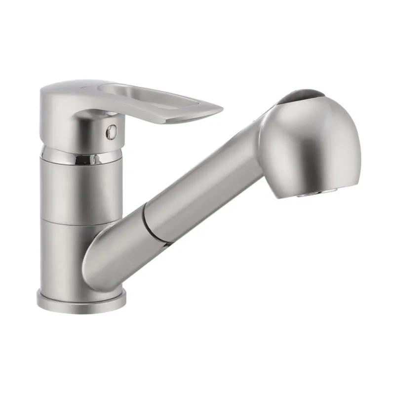 Змішувач для кухні з висувним виливом Hansberg 014 Satin виконаний з латуні. Виріб відмінно витримує будь-які температурні перепади, не схильний до корозії і стійко переносить незначні механічні пошкодження. Верхній декоративний шар хром надійно захищає основний матеріал та надає кухонному змішувачу з висувним зливом привабливогозовнішнього вигляду.
