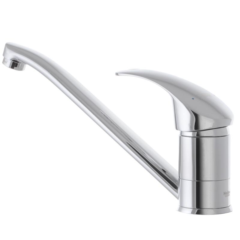 Змішувач для кухні Haiba Mars 555 (HB0268) зроблений з сантехнічної латуні категорії А з хромованою поверхнею. Управління напором і температурою води проводиться однією рукою. Запірний картридж, розташований під керуючої ручкою, підлягає заміні після стирання керамічний пластин запірного механізму. Вилив - низький, поворотний, оснащений аератором. Кріплення на мийку або стільницю включає різьбову шпильку,; гумову прокладку і сталеву фігурну фіксуючу шайбу. Гаряча і холодна вода подається по шлангах гнучкого підведення, які входять в комплект поставки.