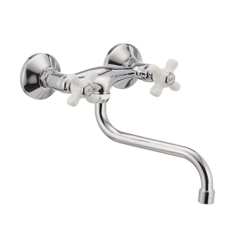 Місце приєднання прикривається декоративними ковпачками, які входять в комплект поставки. Матеріал корпусу - лита латунь категорії А. Поверхня - дзеркальна, хромована. Вилив - хромована сталева трубка, яка вільно повертається вправо і вліво. Управління водою - роздільне, двуручне. Органи управління - напівоборотні керамічні букси.