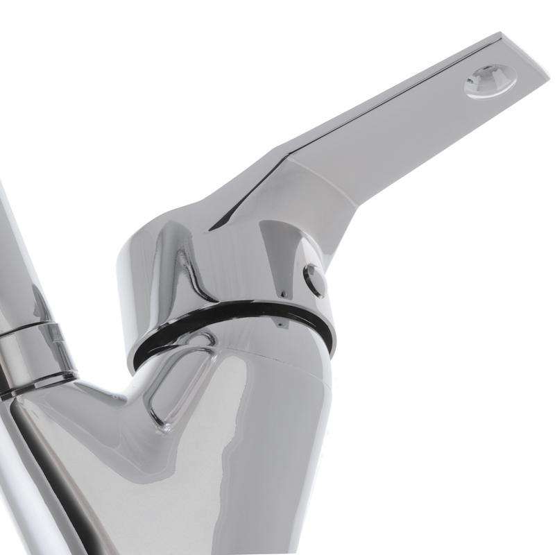 Одноручковий змішувач для кухні Haiba Zeon 777 (HB0416) закріплюється безпосередньо на виробі за допомогою гайки, і для під'єднання вже має гнучкі 45 см підводи з нержавіючої сталі з діаметром 1/2 ". Сам змішувач виконаний з сантехнічної латуні марки А і покритий хромом. В як запірний елемент в ньому використовується картридж діаметром 40 мм від іспанської компанії Sedal. Завдяки його керамічним пластинам руху ручки максимально плавні і без характерних ривків. картридж замінний. Змішувач вже має вбудований аератор Neoperl для обмеження максимальної витрати води.