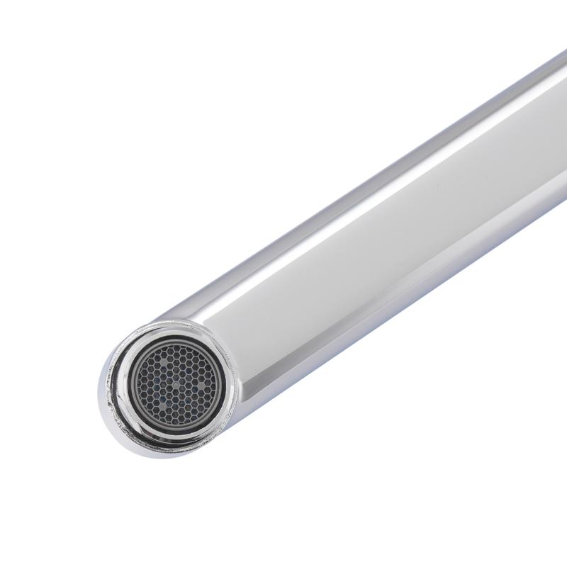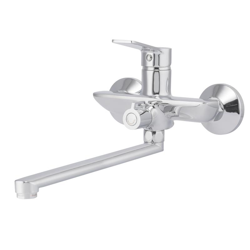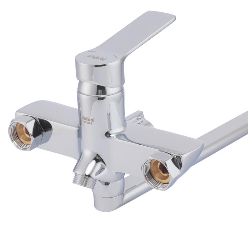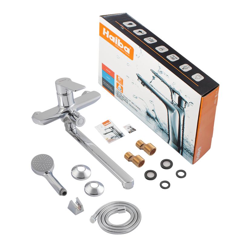 Одноручковий змішувач для ванни Haiba Diana 006 (HB1016) закріплюється за допомогою ексцентриків на трубах водопостачання вмонтованих в стіну. Його особливістю є поєднання євро перемикача, 35 мм іспанського картриджа і 322 мм поворотного виливу з вбудованим аератором, що забезпечує економічність, довговічність та зручність використання. Важливо відзначити і комплектацію, яка включає 5 режимну лійку, 1,5 метровий шланг, ущільнювачі, ексцентрики з декоративними чашками, тримач для лійки і аератор. Виготовлений змішувач з латуні категорії А, хромований і відполірований до сталевого блиску.