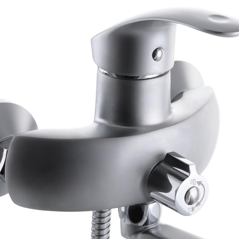 Одноручковий змішувач для ванни Haiba Mars 006 матовий (HB0256) закріплюється ексцентриками на вмонтовані в стіну труби водопостачання. Для приємного зовнішнього вигляду до ексцентрикам йдуть декоративні чашки, а сам змішувач має матове хромування. Його корпус виготовлений з латуні категорії А. Вилив поворотний з вбудованим аератором Neoperl для зниження витрати води. З метою зручності змішувач має євро перемикач і 40 мм іспанський картридж як запірний елемент. Кріпиться він на труби водопостачання. А його комплектація вже включає ексцентрики, гумові прокладки, декоративні чашки, 5 режимну лійку, шланг довжиною 150 см, аератор і настінний металевий тримач.